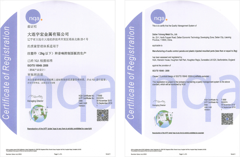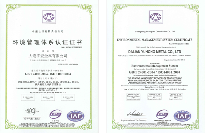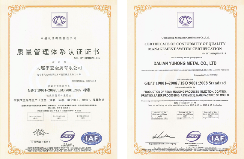 大連宇宏智能科技有限公司憑借嚴(yán)格的管理、先進(jìn)的技術(shù)、一流的服務(wù),先后于2012年通過(guò)了ISO9001質(zhì)量管理體系和 ISO14001環(huán)境管理體系認(rèn)證,2015年通過(guò)了TS16949質(zhì)量管理體系認(rèn)證。
